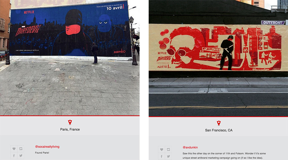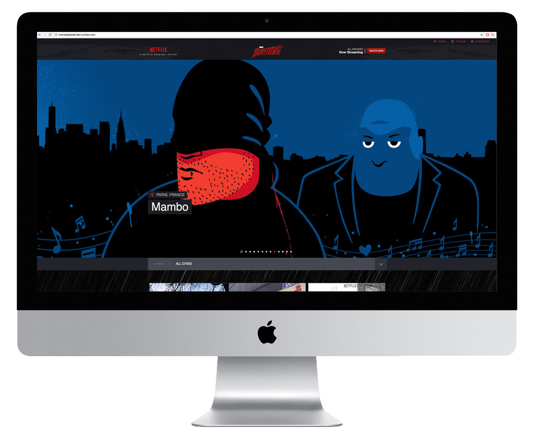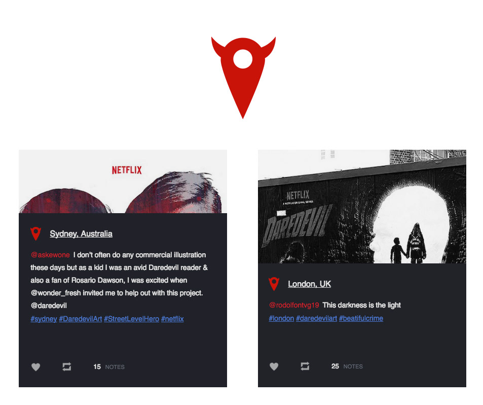 Digital, social, and experiential campaign for Netflix's Daredevil. Social and digital explored themes of good vs. evil. For the experiential we had 13 artists in 13 cities around the world put up Daredevil murals in their towns.