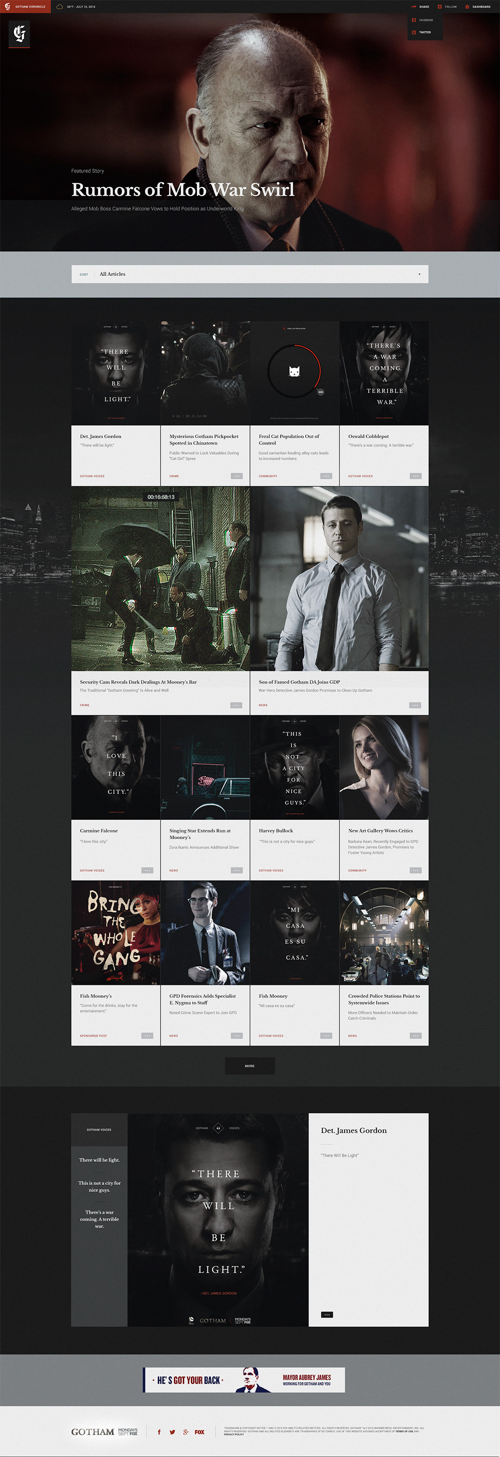 Web design and direction for Fox's TV series, Gotham. This site won Awwwards, Site of the Day.